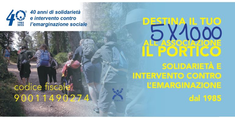 Puoi contribuire a sostenere le attività de IL PORTICO di animazione sociale e ospitalità di persone emarginate destinando il tuo 5×1000 della tua dichiarazione dei redditi all’associazione. Non costa nulla, ma conta moltissimo!