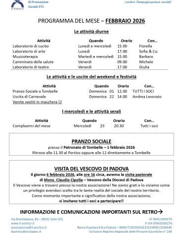 Domenica 1 Febbraio '26 - PRANZO SOCIALE del Portico a TOMBELLE